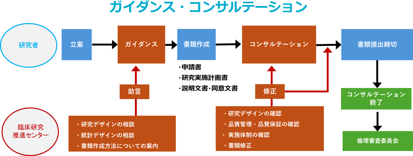 ガイダンスでは、広く観察研究から介入研究まで、研究計画の立案段階において、実施可能性を踏まえて、研究計画の骨子(目的、対象、選択除外基準、検査項目、評価項目、統計手法等)に関して対面助言を行います。また、必要に応じて研究実施体制(モニタリング、データ管理、監査、安全性評価等)について整備を開始します。研究者は、ガイダンスで得た情報を参考に、研究組織の構成メンバーを募り、より具体的な研究実施計画を練り上げていきます。なお、他の医療機関を主施設とする多施設共同研究で既に主施設で倫理審査委員会が承認している場合等は、直接コンサルテーションを受けることを可能としています。
